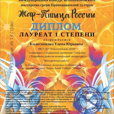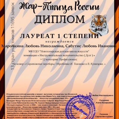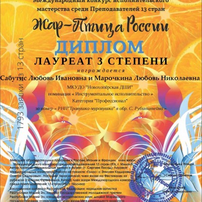 Преподаватели Новохоперской детской школы искусств постоянно самосовершенствуются и показывают свои достижения на конкурсах профессиональной направленности. «Жар-птица России» - международный конкурс исполнительского мастерства, который проходит при поддержке Министерства культуры РФ среди преподавателей 13 стран. Конкурс пользуется большой популярностью и авторитетом. Инструментальный дуэт педагогов школы Любови Сабутис (аккордеон) и Любови Марочкиной (баян) стали дважды лауреатами 1 степени, исполнив русскую народную песню «Травушка-муравушка» и композицию «Саратовские переборы» в категории «Профессионал». Преподаватель теоретических предметов Елена Колесникова заняла 1 место в специальной номинации за разработку урока по музыкальной литературе «Раскрытие жанровых особенностей на примере мюзикла Э.Уэббера «Кошки».