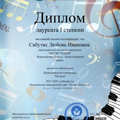В копилке работников Новохоперской ДШИ много побед в конкурсах профессионального мастерства, организованных Международным центром проведения и разработки интерактивных мероприятий «Талант педагога». Любовь Сабутис пополнила этот список очередной победой, став лауреатом 1 степени во Всероссийской олимпиаде «Музыка».