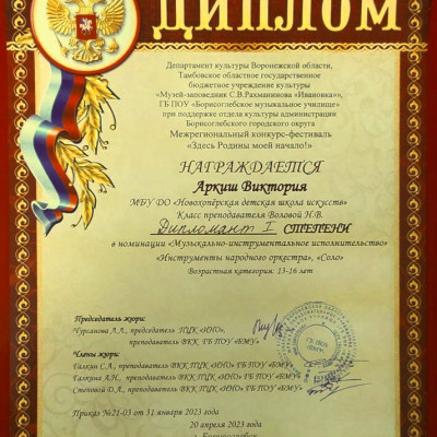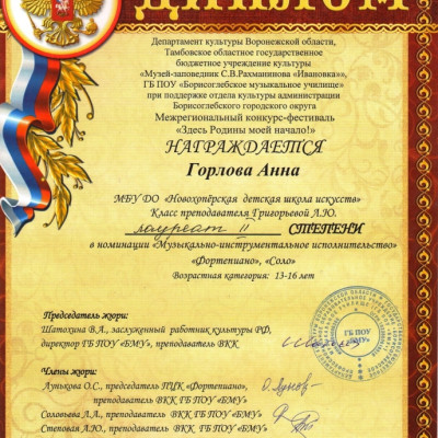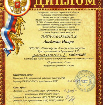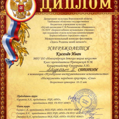 В середине апреля в городе Борисоглебске стартовал Межрегиональный конкурс профессионального исполнительства «Здесь Родины моей начало!». Он открылся хореографическим искусством, вслед за которым продолжили свое конкурсное творчество инструментальные и вокальные отделения. С 19 по 20 апреля свой уровень исполнительства показали пианисты и народники. Высокие результаты выступлений, которых добились преподаватели и их воспитанники – итог огромной кропотливой работы, большого эмоционального и физического труда. Звание лауреата 2 степени получили Анна Горлова (фортепиано, старшая группа, преподаватель Л.Григорьева) и Иван Киселев (домра, средняя группа, преподаватель Н.Прачковская). Ребята исполнили сложную по содержанию и технике программу. С небольшим отрывом от наших лауреатов выступили Инара Акеджан (фортепиано, младшая группа, преподаватель Л. Григорьева) и Виктория Акриш (баян, старшая группа, преподаватель Н.Волова), которые были награждены званием дипломантов 1 степени.