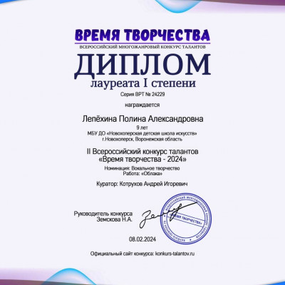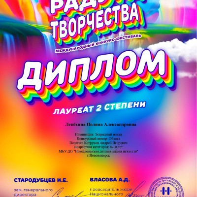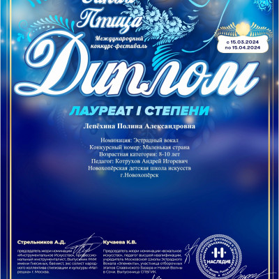 Ученица хорового отделения класса преподавателя Котрухова Андрея Игоревича Лепёхина Полина приняла участие сразу в нескольких конкурсах, где стала лауреатом 1 и 2 степени: Всероссийский многожанровый конкурс талантов «Время творчества», Международный конкурс-фестиваль «Радуга творчества», Международный конкурс-фестиваль «Синяя птица».