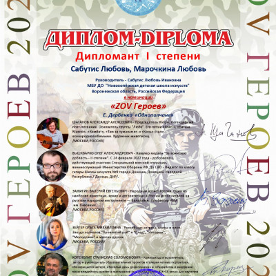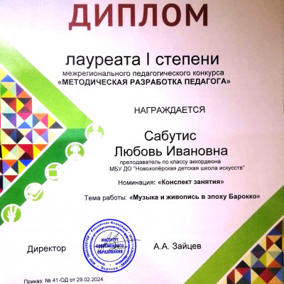 Не отстают от своих воспитанников и преподаватели школы Любовь Сабутис и Любовь Марочкина стали дипломантами 1 степени в 12 Международном многожанровом креатив-конкурсе. Так же Сабутис Любовь Ивановна стала лауреатом 1 степени в Межрегиональном педагогическом конкурсе «Методическая разработка педагога.
