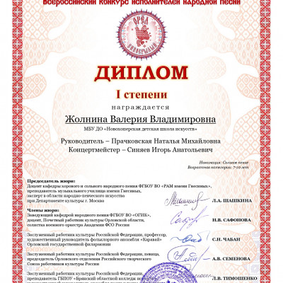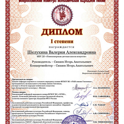 Во Всероссийском конкурсе исполнителей народной песни приняли участие Жолнина Валерия (руководитель Наталья Прачковская, концертмейстер Игорь Синяев) и Шелухина Валерия (руководитель и концертмейстер Игорь Синяев). Девочек наградили дипломами 1 степени.