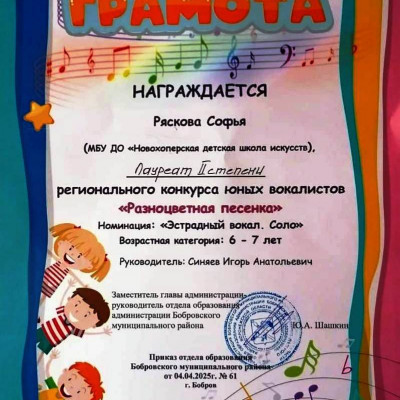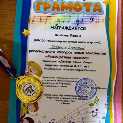 Воспитанницы Новохоперской детской школы искусств Полина Лепехина (преп. Андрей Котрухов) и Софья Ряскова (преп. Игорь Синяев) приняли участие в Региональном конкурсе юных вокалистов «Разноцветная песенка», который прошел 4 апреля в г.Боброве. Девочки выступили в разных номинациях и были высоко отмечены членами жюри. В возрастной категории 8-10 лет Полина заняла первое место, Софья получила диплом лауреата II степени среди участников 6-7 лет.