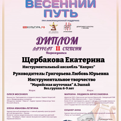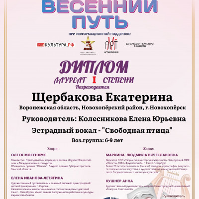 Воспитанница Новохоперской детской школы искусств Екатерина Щербакова обучается на двух отделениях: под руководством Любови Григорьевой осваивает фортепиано и постигает основы живописи на занятиях Елены Гусейновой. Дополнительно Катя занимается вокальным искусством у преподавателя Елены Колесниковой. В копилке ее достижений уже немало наград. На одном из последних конкурсов жюри достойно оценила ее творчество. В Международном многожанровом конкурсе искусств «Весенний путь» Екатерина получила звание лауреата 1 степени в номинации «Эстрадный вокал», а в составе инструментального трио юная пианистка вместе с Любовью Григорьевой (синтезатор) и Алексеем Зюзиным (электрогитара) стала лауреатом 2 степени. Подравляем!