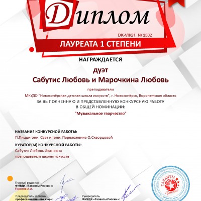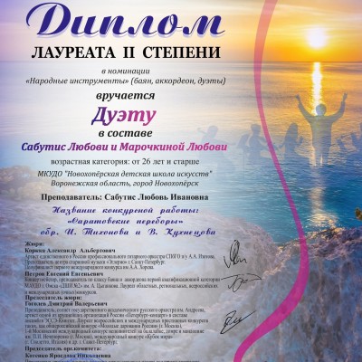 Не забыли про исполнительское искусство во время летнего отдыха и преподаватели Новохоперской детской школы искусств. Любовь Марочкина и Любовь Сабутис большую часть своей жизни посвятили музыке, если точнее, преподавательской деятельности, но творческим людям свойственно не только обучать, но и творить самим. Они влюблены в свои инструменты (баян и аккордеон) и с удовольствием встречаются в нерабочее время и играют дуэтом. Прежде, чем принять участие в Международном конкурсе инструментального исполнительства «Музыкальный рассвет» и Всероссийском конкурсе «Таланты России», преподавателям пришлось приложить много труда и терпения при разучивании музыкальных композиций. Как оказалось - не зря! За исполнение композиции «Саратовские переборы» в обработке И.Тихонова и В.Кузнецова дуэт получил звание лауреата 2 степени на Международном конкурсе. А пьеса П.Пиццигони «Свет и тени» принесла дуэту лауреатство 1 степени на Всероссийском конкурсе. Почти полгода дуэт шел к этим победам. Именно столько времени преподаватели оттачивали свое мастерство при разучивании этих музыкальных произведений. Их труды принесли свои плоды.
