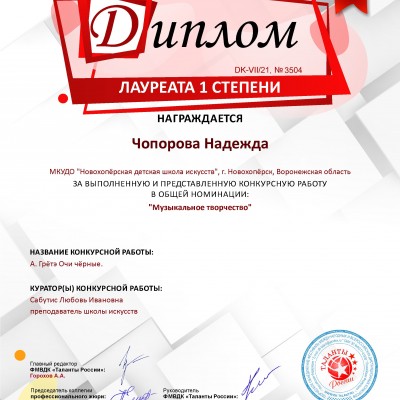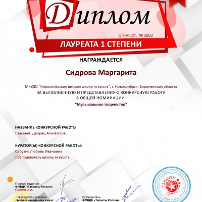 В преддверии наступившего учебного года учащиеся Елань-Коленовского структурного подразделения Новохоперской детской школы искусств Чопорова Надежда и Сидрова Маргарита (класс преподавателя Сабутис Л.И.) приняли участие во Всероссийском конкурсе «Таланты России». Для девочек это было нелегкой задачей. Сложность заключалась не только в конкурентной борьбе: в конкурсе участвовало более ста человек. Подготовка к конкурсу проходила во время летних каникул, когда все ученики отдыхают от школьных занятий. Иногда приходилось отказываться от гуляний с друзьями и купаний в реке, чтобы достичь поставленной цели. Надежда и Маргарита справились со всеми трудностями и с достоинством сумели показать, чего они достигли в результате кропотливого труда над каждой пьесой. Обе ученицы стали лауреатами 1 степени.