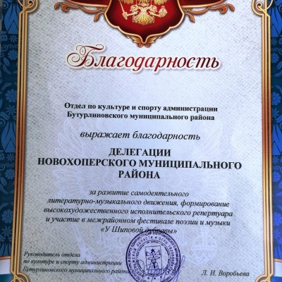 В малых городах России и сельской местности различного типа фестивали и конкурсы всегда проходят в особенно теплой, близкой и доброй между участниками обстановке. Атмосфера простого сердечного общения всегда подкупает своими искренними и открытыми чувствами. Именно в такой обстановке прошел межрайонный фестиваль поэзии и музыки «У Шиповой дубравы» в Бутурлиновском муниципальном районе.