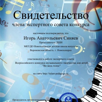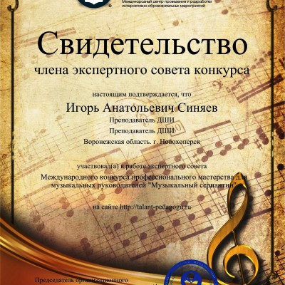 Преподаватели Новохоперской школы искусств не исключение из тех, кто ищет современные подходы к решению профессиональных задач. Игорь Анатольевич Синяев, активно участвующий в конкурсах профессионального мастерства, решил попробовать свои силы в роли члена экспертного совета одного из таких конкурсов. Он подал заявку в организационный комитет Международного центра проведения и разработки интерактивно-образовательных мероприятий «Талант педагога» и принял участие в сложной работе экспертного совета некоторых конкурсов.
