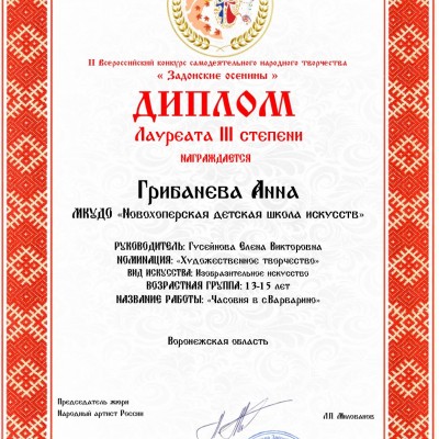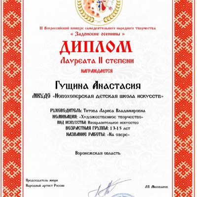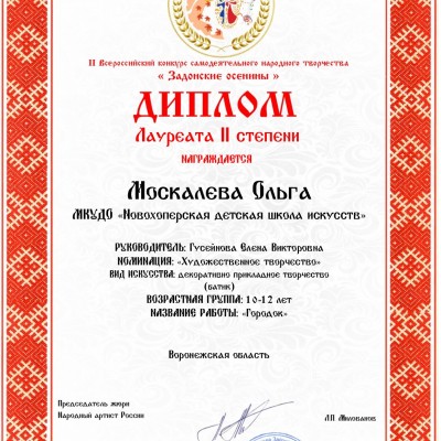II Всероссийский дистанционный конкурс самодеятельного народного творчества «Задонские осенины» проводился Задонским центром культуры и досуга совместно с администрацией г.Задонска при поддержке Липецкого областного центра культуры, народного творчества и кино. Преподаватели и обучающиеся отделения изобразительного искусства Новохоперской ДШИ сочли этот конкурс интересным, современным и актуальным для себя. Призерами конкурса стали: Гущина Анастасия (рук. Л.Титова), Москалева Ольга, Грибанева Анна, Короткова Анна (рук. Е.Гусейнова), Катунина Анастасия (рук. О.Иванникова).