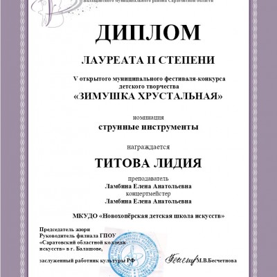 Ученица 2 класса отделения «Струнные инструменты» Новохоперской ДШИ Лидия Титова (преподаватель - Елена Ламбина) впервые участвовала в конкурсе исполнительского мастерства. Её выступлением для V открытого муниципального фестиваля-конкурса детского творчества «Зимушка хрустальная» в г. Балашове Саратовской области стала шуточная белорусская народная песня «Савка да Гришка», которая принесла юной скрипачке звание лауреата II степени.