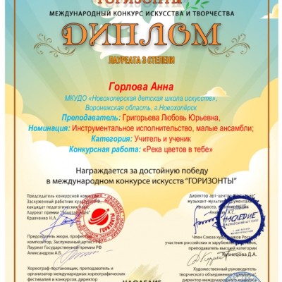 - Горлова Анна (фортепиано, преп. Григорьева Л.Ю.)