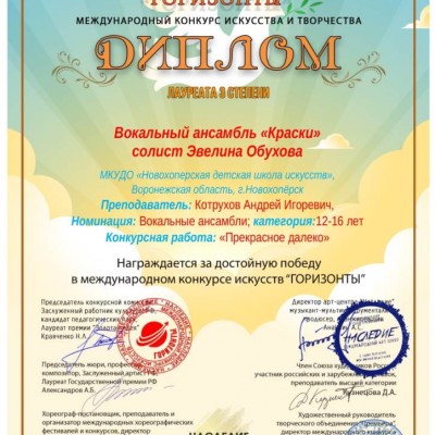 - Ансамбль «Краски», солист Эвелина Обухова (хоровое пение, преп. Котрухов А.И.)