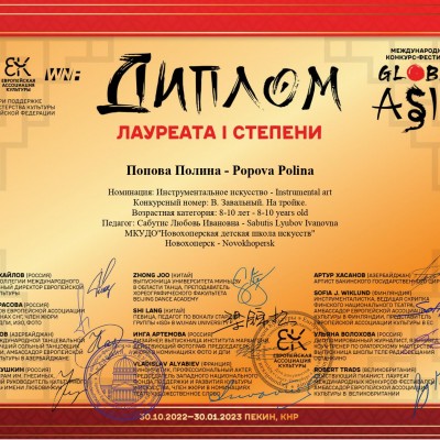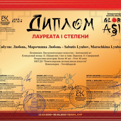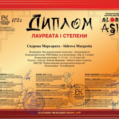 С 30 октября 2022 г. по 30 января 2023 г. в г. Пекине (КНР) при поддержке Министерства культуры Российской Федерации и информационном сопровождении государственного портала «Pro Cultura» проходит I Международный конкурс-фестиваль «Global Asia» (онлайн-формат). Для оценки конкурсных номеров создано высокопрофессиональное жюри, в состав которого входят известные деятели культуры Российской Федерации, СНГ, Европы.