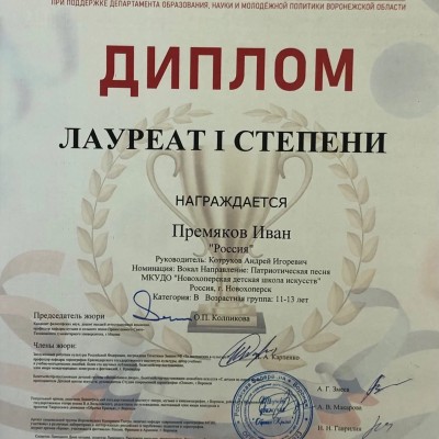 С патриотической песней в заочной форме выступал Иван Премяков. Юный вокалист не подвел своего руководителя Андрея Котрухова, вложив в свое исполнение чувства и образное мышление, став обладателем звания лауреата 1 степени.