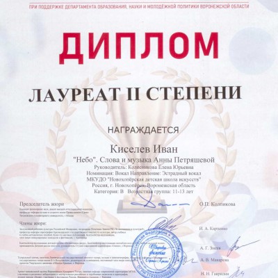 С интересной программой в номинации сольное пение выступил Иван Киселев (руководитель Елена Колесникова). Иван покорил жюри своей непосредственностью и проникновенным исполнением, что принесло ему победу на конкурсе и диплом лаурета 2 степени.