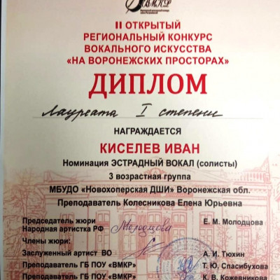 1 декабря Иван и Екатерина приняли участи в Региональном конкурсе эстрадного пения «Юные таланты», организатором конкурса выступил Учебно-методический центр сферы культуры и искусства Воронежской области. Конкурс собрал более 170 талантливых и целеустремленных участников. И здесь наши участники показали высокие результаты. Иван Киселев стал лауреатом 3 степени, Екатерина Щербакова отмечена дипломом за участие.
