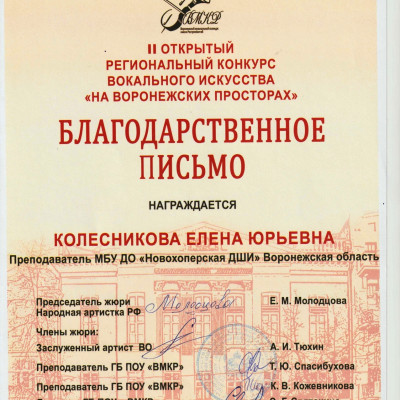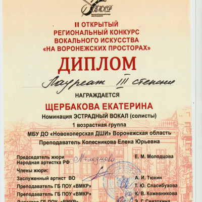 30 ноября 2025 года в Воронежском музыкальном колледже имени Ростроповичей проходил II открытый региональный конкурс вокального искусства «На Воронежских просторах», при поддержке Министерства культуры Воронежской области, Учебно-методического центра сферы культуры и искусства, депутата Государственной Думы РФ С. В. Чижова, по инициативе народной артистки РФ Екатерины Михайловны Молодцовой. 180 молодых дарований из разных регионов России состязались за право быть лучшими в вокальном исполнительстве. Наши учащиеся, класса преподавателя Елены Колесниковой, достойно себя показали и стали победителями конкурса: Ивану Киселеву присвоено звание лауреата 1 степени, Екатерине Щербаковой – звание лауреата 3 степени.