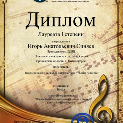 Новохоперская детская школа искусств в лице преподавателя отделения народных инструментов и вокальных дисциплин Игоря Синяева приняла участие в этом интересном конкурсе. Игорь Анатольевич представил на конкурс рабочую программу по эстрадному вокалу. Этой программой он успешно пользуется в своей педагогической деятельности, год от года внося в нее что-то новое, не теряя стержень импровизации и творчества профессионального труда. Программа была оценена высшими баллами и принесла нашему преподавателю Диплом лауреата 1 степени.