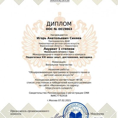 Одновременно программа эстрадного пения была отправлена на ещё один не менее значимый Международный педагогический конкурс «Педагогика XXI века: опыт, достижения, методика», где Игорь Синяев также получил звание лауреата I степени. Организатор конкурса - Всероссийский центр образования и развития «Миллениум».