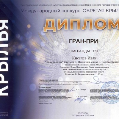 Новохоперскую детскую школу искусств в номинации «Вокал» представил Иван Киселев , ученик преподавателя Колесниковой Елены Юрьевны. Иван покорил зрителей и жюри песней из кинофильма «Любовь земная» - «Даль великая» (музыка Е. Птичкина, слова Р. Рождественского). Своим выступлением юному исполнителю удалось создать яркий художественный образ в исполняемом произведении и показать высокий технический уровень исполнительского мастерства. Итог выступления - высшая награда участника - Гран-при конкурса.