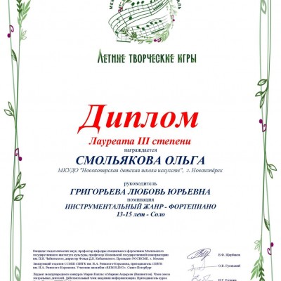 В искусство нет прямой дороги Туда нельзя купить билет Талант - лишь допуск на пороги А дальше - Труд и поиск лет! Какая замечательная, творческая, сложная и увлекательная задача - работать над музыкальным произведением! Освоить ноты, длительности, натренировать свою голову так, что твои руки и пальцы безошибочно и слаженно выполняют все ее команды - идут к воплощению замысла композитора. И ты в силах понять, почувствовать, пережить, пропустить через свое сознание и воплотить музыкальный образ. Одна из форм вознаграждения музыканта за его тяжелый труд - это победы на конкурсах профессионального мастерства. Именно такую награду получили преподаватель и ученик Новохоперской детской школы искусств за выступление на Международном конкурсе-фестивале в Москве «Летние творческие игры» в июле 2021 года. Выпускница школы искусств Ольга Смольякова стала лауреатом III степени в старшей возрастной группе, в номинации «Инструментальный жанр - фортепиано, соло». Оля исполняла сложное по технике и содержанию произведение русского композитора - Музыкальный момент Сергея Рахманинова. - Произведение далось нам нелегко, мы готовили его почти год, думали, пробовали, сопоставляли, тренировались, грустили, плакали, радовались и, наконец, решили попробовать свои силы в достойном конкурсе. Особенно радует нас, что мы получили лауреатство при составе жюри, председателем которого был кандидат педагогических наук, профессор кафедры специального фортепиано Московской государственной консерватории им. П.И.Чайковского В.Ф.Щербаков, - так комментирует участие в этом конкурсе преподаватель Любовь Григорьева. - Я очень рада, что мне пришлось заниматься с Олечкой, она, как говорится в эпиграфе нашей статьи, своим талантом допущена на пороги искусства и великого труда в нем. А также Оля в этом году была не только выпускницей нашей школы искусств и выдержала нелегкие экзамены, но и достойно окончила 9 классов общеобразовательной школы и сейчас строит планы по выбору будущей профессии и учебного заведения, где она будет получать дальнейшее образование. Хочу пожелать ей никогда не расставаться с музыкой, с искусством. Поздравляю с одновременным окончанием двух школ. Благодарю за совместное творчество!