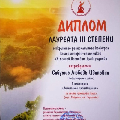 В конкурсе «Я песней воспеваю край родной» приняла участие преподаватель Новохоперской детской школы искусств Любовь Сабутис, которая написала музыку к песне. Вместе с автором стихов Валентиной Глущенко они представили на конкурс композицию "Любимый край". Как композитор, Любовь Ивановна стала лауреатом III степени. Это был первый опыт написания музыкального произведения. Впереди работа над следующей песней в том же соавторстве.