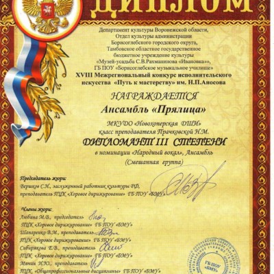 - Фольклорный ансамбль «Прялица» (руководитель Наталья Прачковская) - дипломант 3 степени.