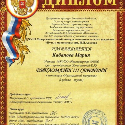 - Кабанова Мария (руководитель Елена Колесникова) - лауреат 3 степени;