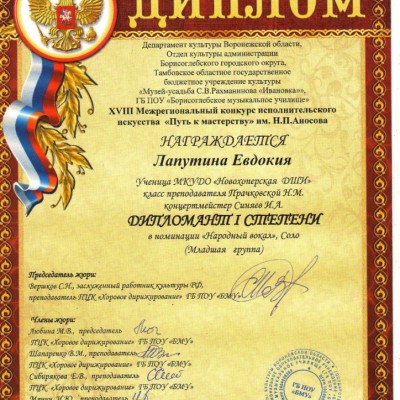 - Латутина Евдокия (руководитель Наталья Прачковская) - дипломант 1 степени;