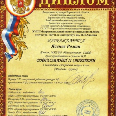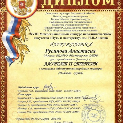 - Русинова Анастасия (руководитель Алексей Зюзин) - лауреат 2 степени.