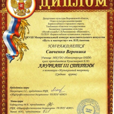 - Савченко Вероника (руководитель Елена Колесникова) - лауреат 3 степени;