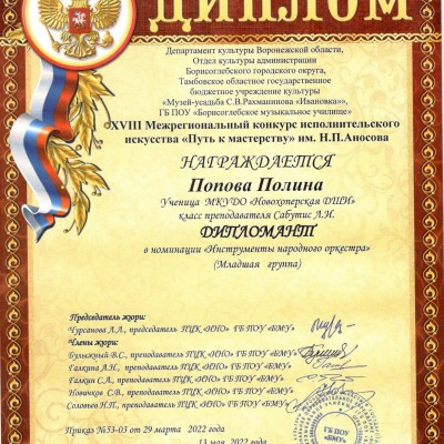 - Попова Полина (руководитель Любовь Сабутис) - дипломант.