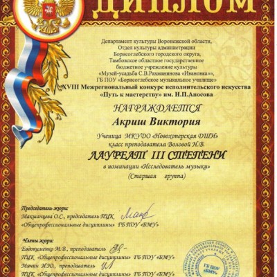 - Акриш Виктория (руководитель Наталия Волова) - лауреат 3 степени;