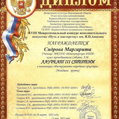 - Сидрова Маргарита (руководитель Любовь Сабутис) - лауреат 3 степени;