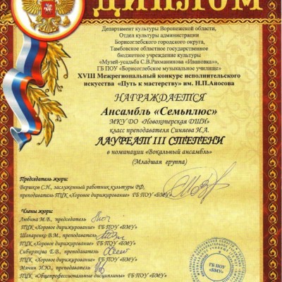 - Вокально-эстрадный ансамбль «Семь+» (руководитель Игорь Синяев) - лауреат 3 степени;