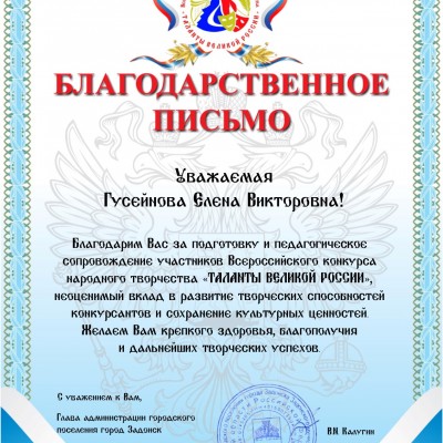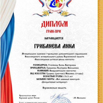 Еще один конкурс с достоинством прошла выпускница отделения изобразительного искусства «Живопись» Анна Грибанева. Юная художница попробовала свои силы во Всероссийском конкурсе народного творчества «Таланты великой России», который состоялся 16 марта 2021 года в городе Задонске Липецкой области. В этом творческом состязании приняли участие представители 70 регионов нашей страны. Аня представила на конкурс одну из своих любимых работ, выполненную под руководством своего учителя Елены Викторовны Гусейновой, «Декоративный натюрморт». Рисунок выполнен в ярких и насыщенных тонах. Несмотря на то, что синий цвет относится к холодным тонам, натюрморт полон мягкости и гармонического спокойствия. Работа Анны Грибаневой привлекла внимание жюри конкурса и была удостоена высшей награды - «Гран-при» в средней возрастной группе.