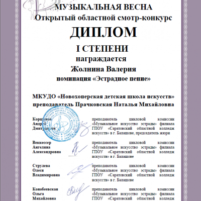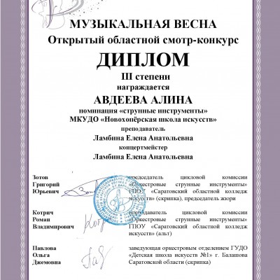 Учащиеся Новохоперской детской школы искусств вот уже на протяжении нескольких лет являются постоянными участниками этого конкурса. В этом году участие принимали Авдеева Алина (отделение струнных инструментов, преподаватель Ламбина Елена Анатольевна) и Жолнина Валерия (отделение эстетического воспитания, преподаватель Прачковская Наталья Михайловна).