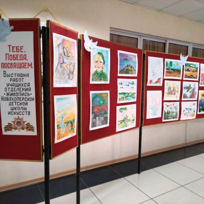 Учащиеся художественного отделения Новохоперской ДШИ приняли активное участие в подготовке к празднованию Дня Победы. Вместе со своими преподавателями они подготовили праздничную экспозицию «Тебе, Победа, посвящаем» в фойе МКУ «Культурно-досуговый центр» г. Новохоперска и выставку творческих работ воспитанников Елань-Коленовского структурного подразделения в МКУ КСК "Кристалл".