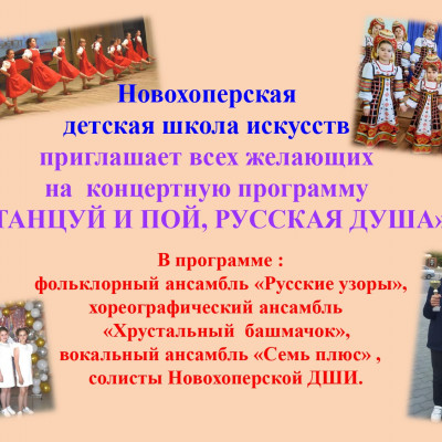 Новохоперская детская школа искусств приглашает всех желающих на свои выездные концерты, которые состоятся в городе и районе, в детских садах, школах и культурно-досуговых центрах. Концертная программа "Танцуй и пой, русская душа!" порадует как самых маленьких слушателей, так и взрослое население. Дата и время проведения концертов согласовывается индивидуально с каждым учреждениями.