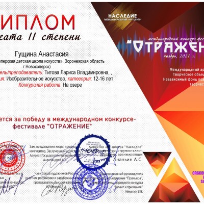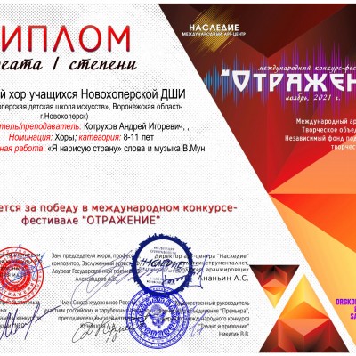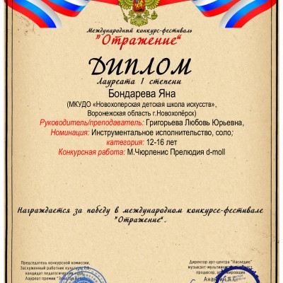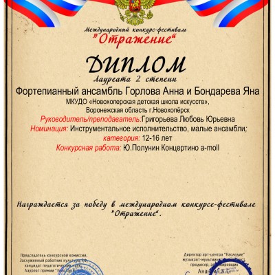 В конце ноября были подведены итоги Международного фестиваля-конкурса искусств «Отражение» города Санкт-Петербурга. Проходил конкурс в заочной форме, собрав всех - от профессионалов до любителей, независимо от возраста и уровня профессиональной подготовки, региона проживания или страны. Учащиеся Новохоперской детской школы искусств участвовали в профессиональных категориях инструментального и вокального исполнительства, изобразительного искусства.