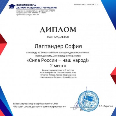 Первоклассница отделения изобразительного искусства Елань-Коленовского структурного подразделения Новохоперской ДШИ Лаптандер София (преподаватель Лариса Титова) приняла участие в конкурсах, организованных Высшей школой делового администрирования (г.Екатеринбург). Один из них был посвящен Дню народного единства, символизирующему сплоченность и единство российского народа, что обеспечивает стране благополучие и процветание.