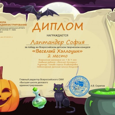 День мира и согласия был основной темой Всероссийского детского конкурса рисунков «Сила России – наш народ!», в котором София заняла 2 место. Также 2 место принес юной художнице ещё один детский творческий конкурс от Высшей школы делового администрирования на шуточную тему «Веселый Хэллоуин».