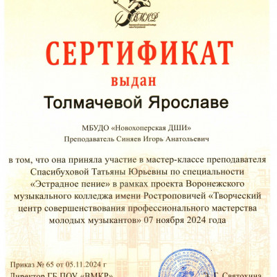 - Хочу выразить огромную благодарность преподавателю по эстрадному пению Спасибуховой Татьяне Юрьевне. Мне было очень интересно и познавательно участвовать в мастер-классе. Урок прошел на одном дыхание, сразу захватила творческая, благоприятная обстановка. Встреча оставила только теплые и радостные впечатления. Большое спасибо всем за организацию совместной творческой встречи учеников и наставников, за интересный профессиональный опыт.