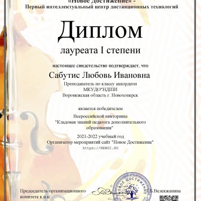 Преподаватель народного отделения Елань-Коленовского структурного подразделения Новохоперской ДШИ Любовь Сабутис получила в День учителя особый подарок. В свой профессиональный праздник она приняла участие во Всероссийской викторине для преподавателей «Кладовая знаний педагога дополнительного образования", организованной Первым интеллектуальным центром дистанционных технологий "Новое Достижение". Задача конкурсантов состояла в решении теоретических заданий и представлении практических навыков. Любовь Ивановна отлично справилась со всеми этапами и по результатам викторины стала лауреатом I степени.