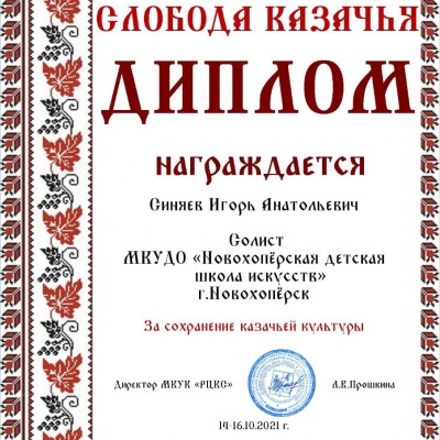 История казачества неотъемлемая часть истории всей Российской цивилизации. Казаки бережно хранят свои традиционные песни, фольклор. Музыкальность, хоровая культура были естественной, отличительной чертой казачьих семей. Традиции казачьего песнопения живы до сих пор. В октябре 2021 года в селе Ямное прошел VII Открытый дистанционный (online) фестиваль казачьей культуры «Ямное – Слобода казачья». В этом году фестиваль был посвящен 325-летию взятия Азова и старшинству «Хопёрского казачества», по теме «Казаком быть — значит Родину любить». В фестивале приняли участие 40 коллективов - дети и взрослые, пели и танцевали, сохраняя казачью культуру, прославляя свои корни и традиции. Ежегодно преподаватель школы Игорь Синяев принимает участие в фестивале казачьего творчества в селе Ямное, этот год не стал исключением. Игорь выступил с песней "Хуторок" и был награжден дипломом. По словам Игоря Синяева: «Фестиваль содействие возрождению, сохранению и популяризации традиционной казачьей культуры: истории, обычаев, обрядов. Помогает нам помнить тех, кто отдал свои души за нашу прекрасную Родину. Память – это звено, которое связывает настоящее и прошлое. И мы, молодое поколение, должны защищать и оберегать то, что досталось нам по наследству. А память о тех, кто отдал свои жизни за свободу и независимость будет жить в наших сердцах вечно». Поздравляем Игоря Анатольевича и желаем дальнейших творческих побед!