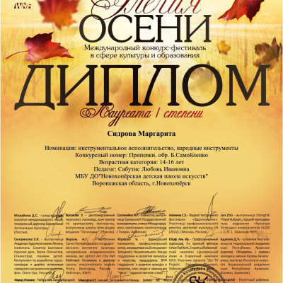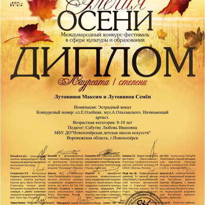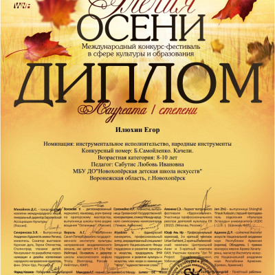 При поддержке профильных Региональных и Федеральных Министерств культуры и образования состоялся Международный конкурс-фестиваль «Элегия осени», в котором приняли участие воспитанники отделения народных инструментов Елань-Коленовского структурного подразделения Новохоперской детской школы искусств под руководством преподавателя Любови Сабутис. Юные аккордеонисты Иванников Артем, Илюхин Егор, Лутовинов Максим, Лутовинов Семен, Попова Полина, Сидров Николай и Сидрова Маргарита стали лучшими, получив звание лауреатов I степени.