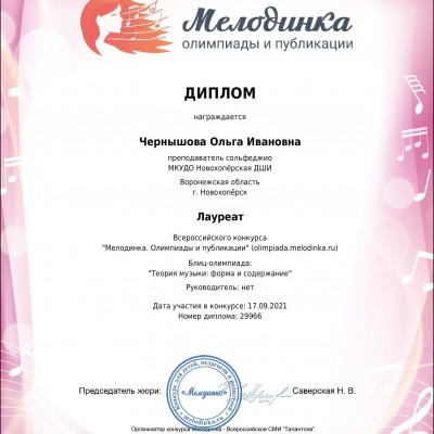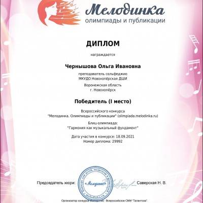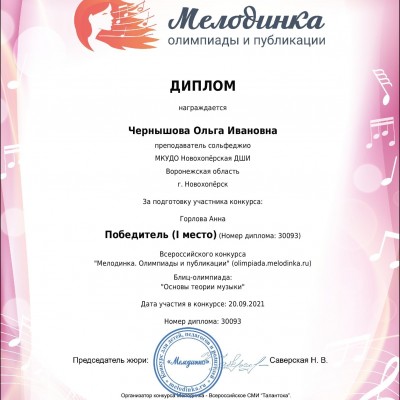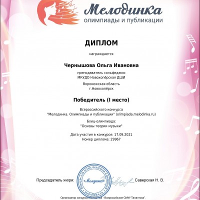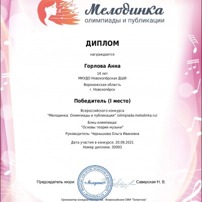 Как только начался учебный год, преподаватели и учащиеся школы активно и творчески включились в учебный процесс. Преподаватель теоретических дисциплин Новохоперской ДШИ Ольга Ивановна Чернышова и учащаяся 8 класса отделения «Фортепиано» Горлова Анна приняли участие в серии дистанционных олимпиад «Мелодинка» для преподавателей и учащихся музыкальных школ. Аня показала отличные результаты в блиц-олимпиаде по теме «Основы теории музыки», а её руководитель Ольга Чернышова успешно справилась с заданиями трех блиц-олимпиад: «Теория музыки: форма и содержание», «Гармония как музыкальный фундамент» и «Основы теории музыки».