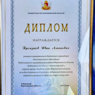 Новый 2023-2024 учебный год начался для самых творческих детей школ искусств Воронежской области с грандиозного события - присуждения им премии Правительства Воронежской области за особые достижения в учебной и творческой деятельности одаренным учащимся в сфере культуры и искусства по итогам 2022 года. Награды победителям на церемонии награждения в Воронежском академическом театре драмы им. А. Кольцовавручала руководитель департамента культуры Воронежской области Мария Мазур.В числе награжденных ученик Новохоперской детской школы искусств Иван Премяков (руководитель Андрей Котрухов). На протяжении многих лет Ваня занимается вокальным исполнительством, многочисленные победы в конкурсах международного и всероссийского уровня позволили ему пройти конкурсные испытания и стать лауреатом престижной денежной премии Правительства Воронежской области.