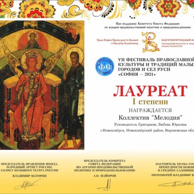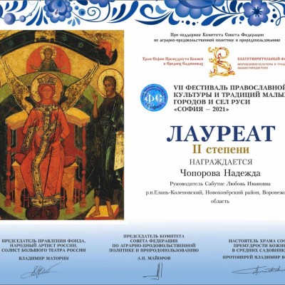В декабре 2021 года состоялся VII Фестиваль православной культуры и традиций малых городов и сельских поселений Руси "София - 2021", организатором которого выступил Благотворительный фонд "Возрождение культуры и традиций малых городов Руси" и храм Софии Премудрости Божией в Средних Садовниках при поддержке Комитета Совета Федерации по аграрно-продовольственной политике и природопользованию. В фестивале приняли участие самодеятельные певческие, танцевальные и инструментальные творческие коллективы и индивидуальные исполнители духовной, русской классической и народной музыки из разных регионов России. В их числе - преподаватели и учащиеся Новохоперской детской школы искусств. По итогам фестиваля ансамбль преподавателей «Мелодия» (рук. Любовь Григорьева, солист Андрей Котрухов) стал лауреатом I степени, инструментальный дуэт «Любаши» (Любовь Сабутис и Любовь Марочкина) получил звание лауреата II степени. Обладателями 2 места стали и юные аккордеонистки Чопорова Надежда, Сидрова Маргарита (класс преподавателя Сабутис Л.И.). От всей души поздравляем призеров фестиваля, желаем и в дальнейшем содействовать сохранению самобытной культуры и традиций родного края.