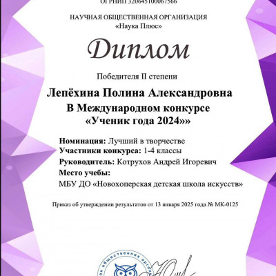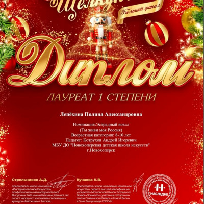 Наступивший Новый год продолжает дарить волшебство и вместе с ним новые победы. Обучающаяся хорового отделения Новохоперской детской школы искусств Полина Лепехина пополнила копилку своих достижений Дипломом лауреата 1 степени Международного конкурса-фестиваля «Щелкунчик» при поддержке Министерства культуры РФ и Дипломом победителя 2 степени Международного конкурса «Ученик года 2024». Результаты конкурсов были подведены в первые дни января и стали отличным подарком для Полины и ее преподавателя Андрея Котрухова. Поздравляем!